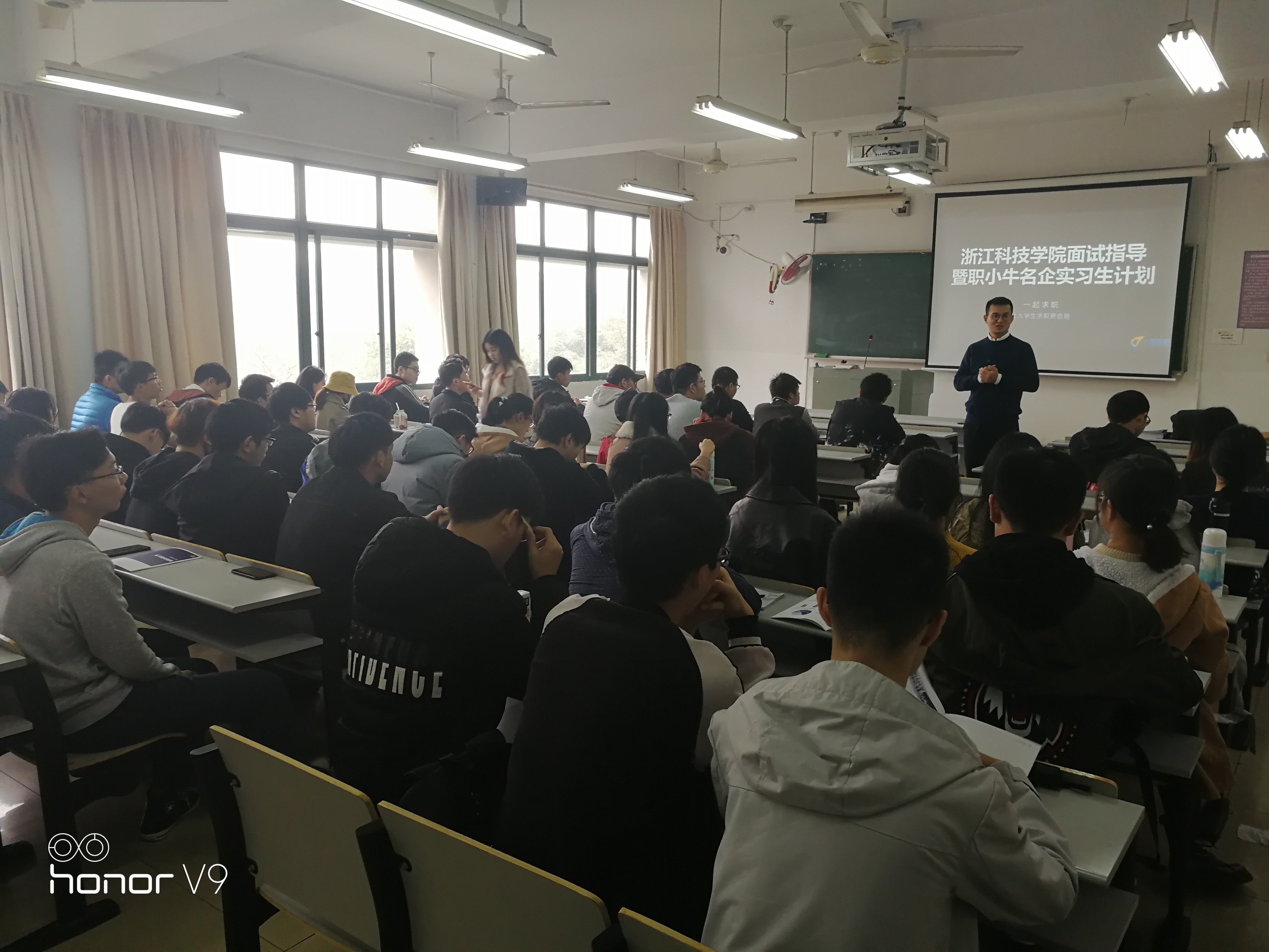联合一起求职公司,为16级学生举办了以“如何完善我的名企梦”为主题的实习动员分享会活动。