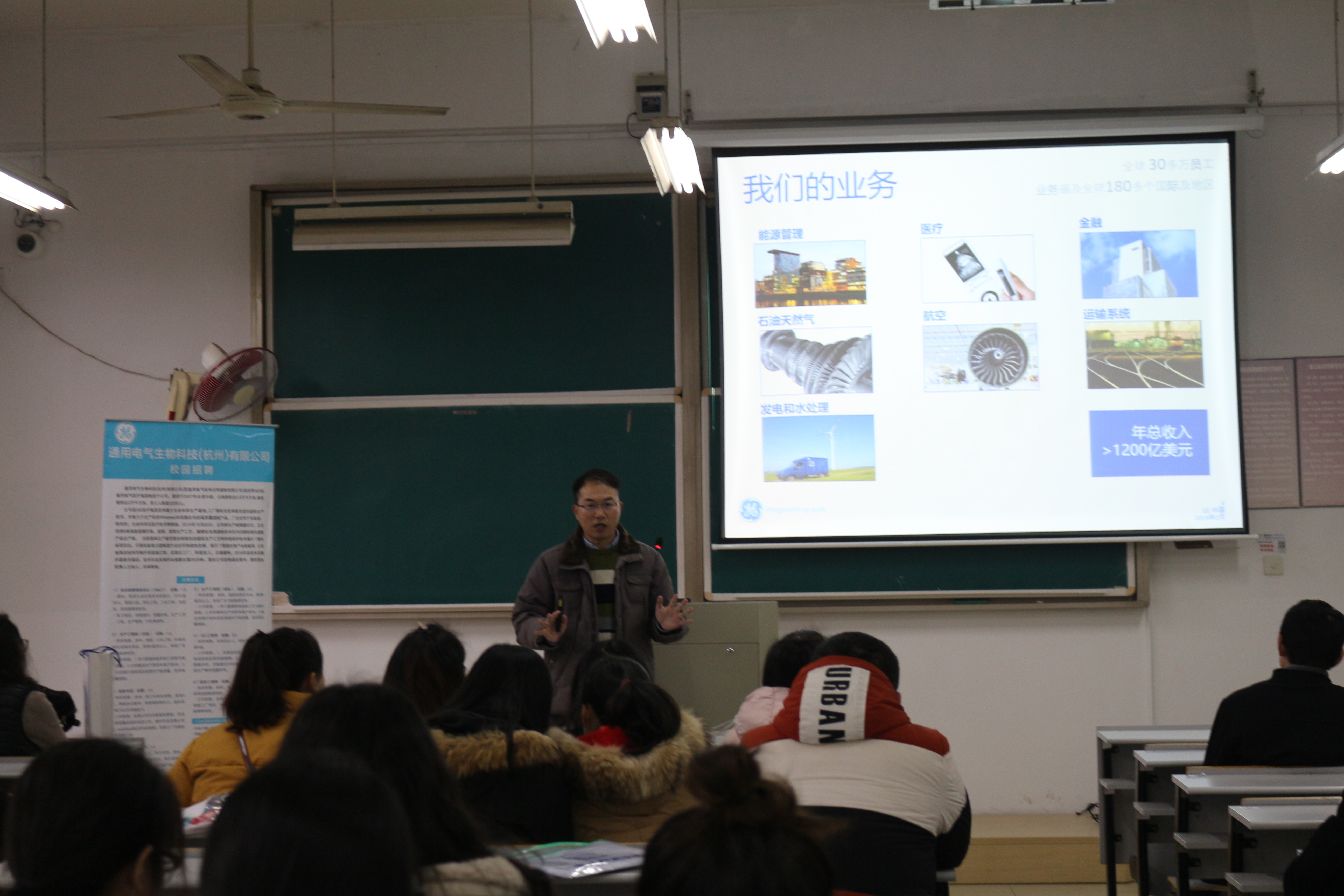 随后,通用电气生物科技(杭州)有限公司总经理吴军、人事经理韩丹、生产主管李文华、QC主管李雅琳依次上台向同学们详细介绍通用电气的概况、企业发展前景、管培生计划以及员工福利等,与此同时,公司也对招聘人才提出了一些学历与能力要求。随后的互动和答疑环节,同学们积极提问,双方相互沟通交流。此次动员会暨宣讲会在咨询和现场面试中渐渐落下帷幕。