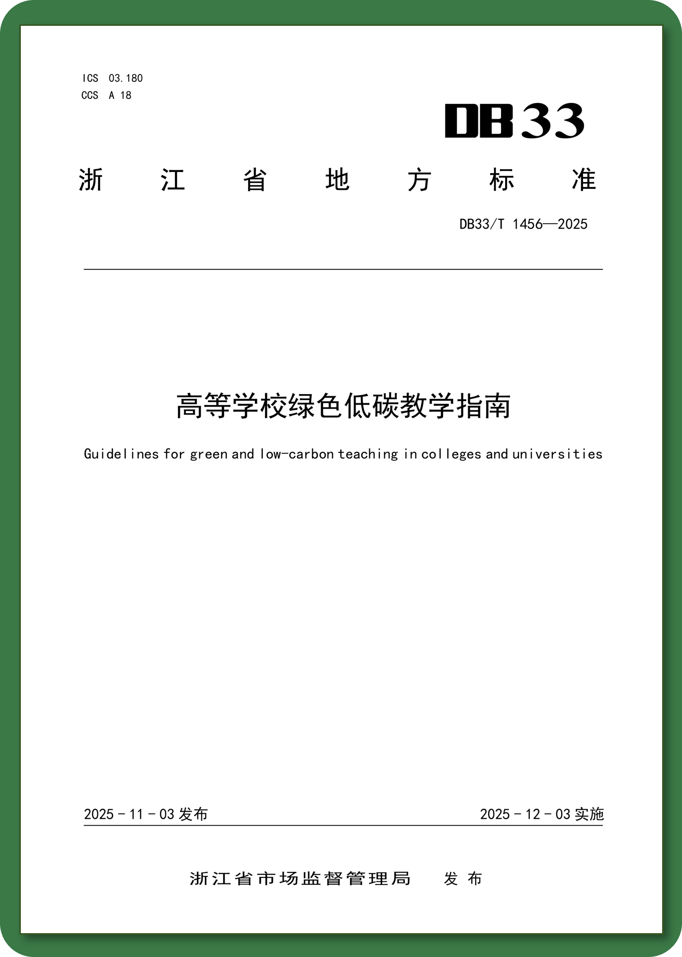 绿色低碳教学指南》(DB33/T 1456-2025),经专家审定,已于2025年11月3日由浙江省市场监管局正式发布,并将于2025年12月3日正式实施。