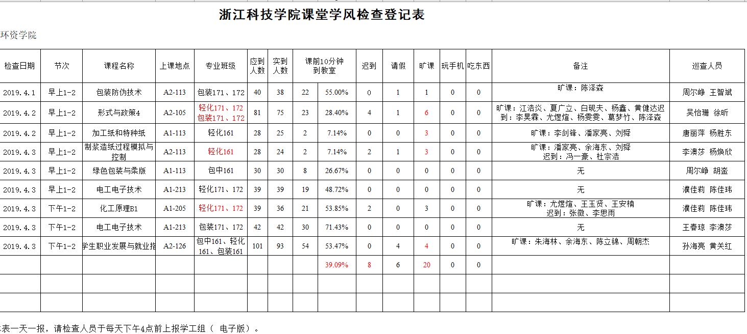 在本周的学风检查中,早上零早餐和零手机的现象依旧保持不错。与上一周相比,本周旷课和迟到的人数大幅增加,提前10分钟到课率也有所下降。对比分析,包装16级和17级普通班没有同学无故迟到或旷课,包装16级中职班偶有同学迟到,轻化16级和17级同学迟到和旷课的现象共存,极个别同学屡次迟到或旷课。对于检查中存在的问题,还请班主任、班长及学习委员以及任课老师共同监督和引导并做到持续改进,帮助学业困难同学调整状态,培育其优良的学风。