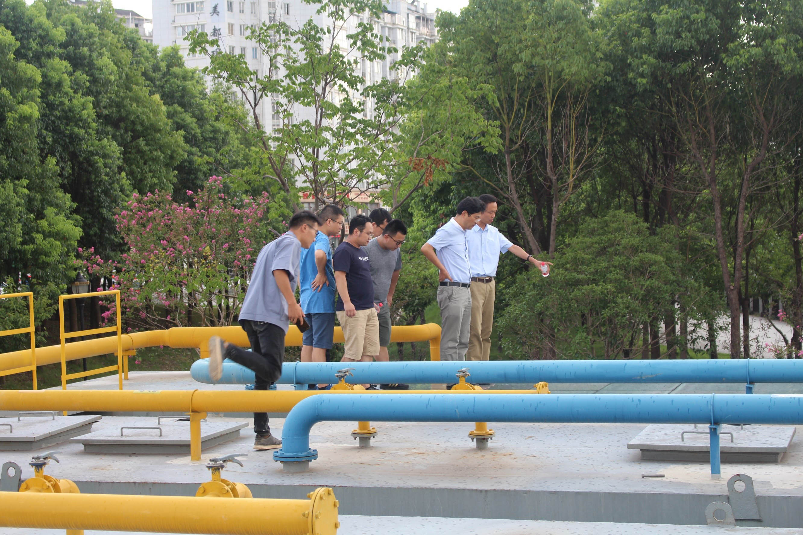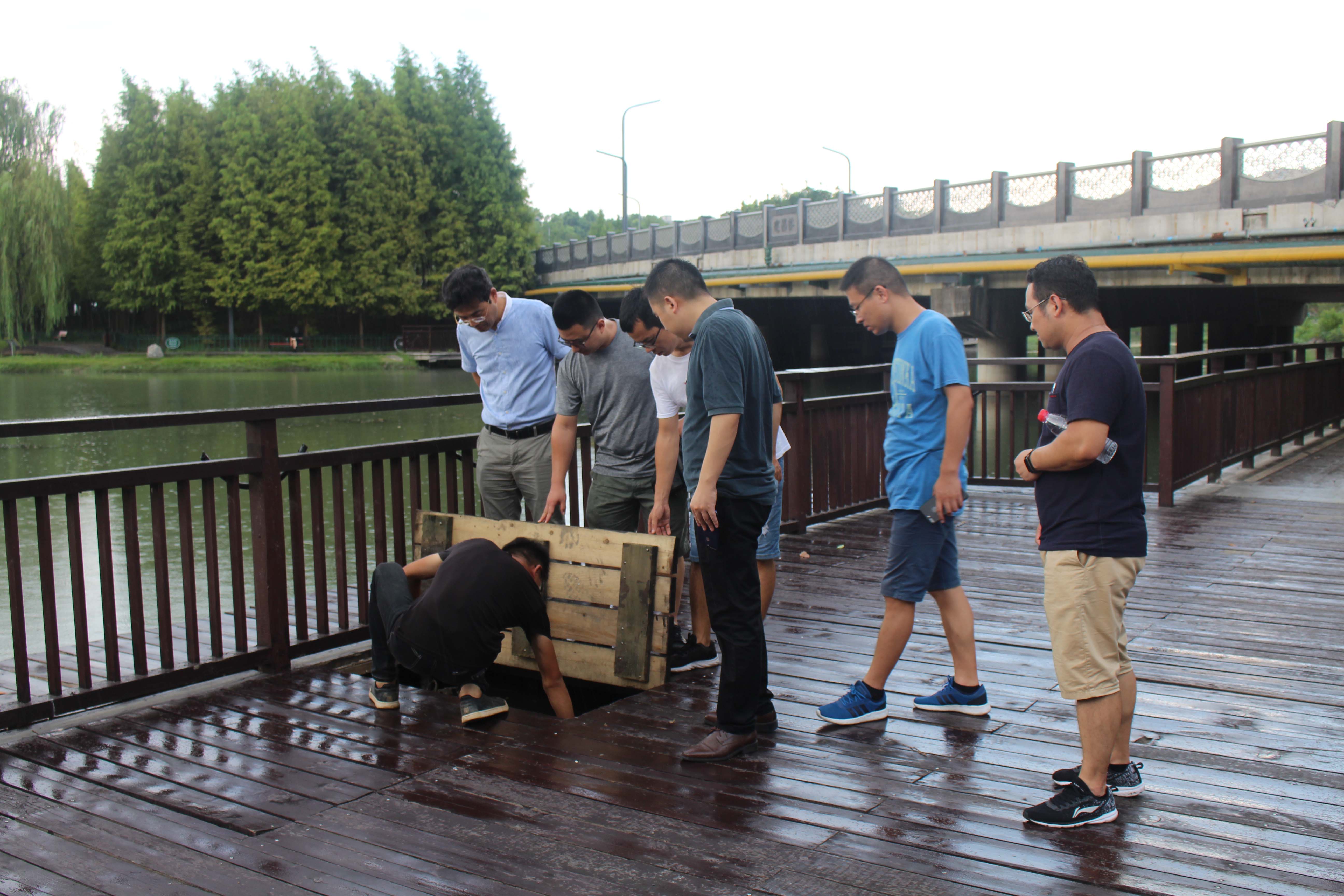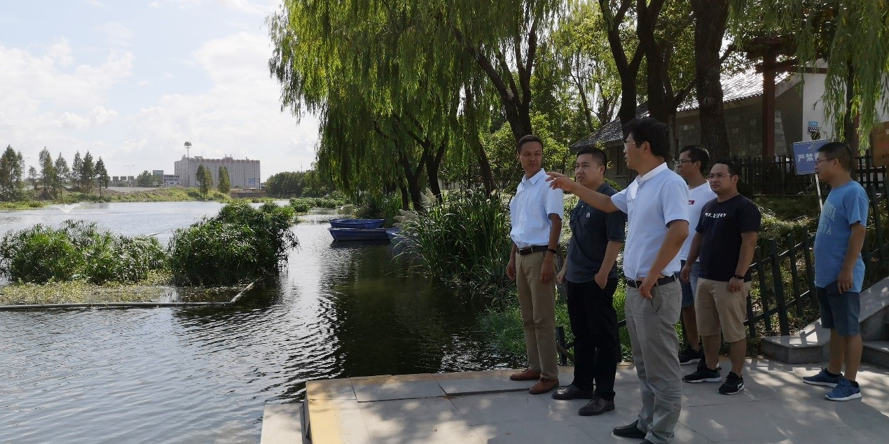 2018年8月15日,双赢彩票 院长单胜道教授带领研究团队人员,在杭州银江环保科技有限公司相关领导和技术负责人的陪同下,先后走访了位于杭州市江干区的“十号河深化生态处理工程”,以及位于湖州市德清县的“建昌桥雨水排放口截污治理工程”和“建昌桥雨污混流排放口治理工程”等污水生态处理示范工程。考察了污水治理现状,就生物浮床、MBR技术、活性污泥等传统污水处理技术的优化和改进等作了探讨,并就合作申报科研项目作了深入交流。