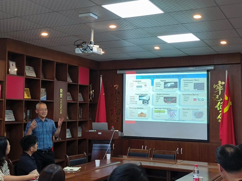 报告中,倪教授介绍了缅因大学化学工程系在制浆造纸学科、纤维基功能材料等研究方向的情况,阐述了目前纳米纤维素的制备方法及功能材料、复合酶选择性断裂半纤维素连接、纤维素网络结构的键合机制等。倪永浩教授还结合自身的研究经历,在创新思路的提出与科研工作的实施等方面阐述了独到见解。报告结束后,倪永浩教授针对学生课题研究情况进行了交流。倪永浩教授此次讲学开阔了专业师生在科学研究方面眼界,坚定了学生学习本专业的信心,让同学们深刻感受科学家的爱国情怀。