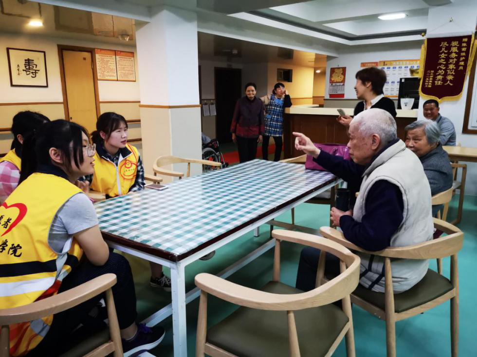 志愿者们身穿黄色小马甲来到西湖区社会福利中心看望老人,陪他们聊天,听老人们谈谈他们曾经有趣的经历,聊聊当前的烦心事。老人们与志愿者交谈甚欢,分享了一些个人经历及经验,如一位老人和志愿者们讲述了在浙大攻读6年,最后成为高级工程师的故事。这让身为大学生的我们,肃然起敬,决心以此为榜样,勤奋读书,刻苦专研,为社会与国家贡献自己的力量。